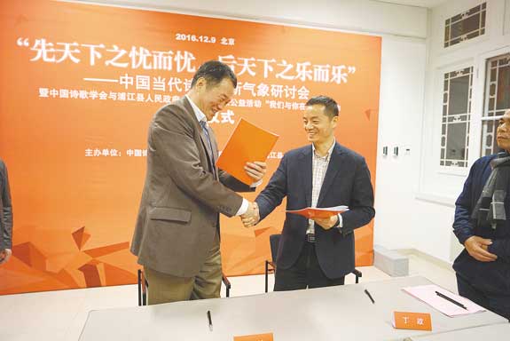 12月9日,中国诗歌学会与浦江县人民政府在北京大学签订共同打造“诗意流淌的地方”战略合作协议。中国诗歌学会会长黄怒波,浦江县委副书记、代县长丁政出席签约仪式。