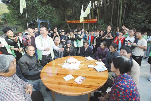行走中,队员中不仅在寻找美、发现美、欣赏美、推介美,也带着一颗微小的公益心践行美,古道走到哪,队友们的微公益就做到哪。了解到塘下村里有几位孤寡老人,就想到给这几位需要帮助的老人一些实实在在的温暖。这个想法也得到了社会上的爱心人士响应,大家出钱出力,有送蛋糕的,有送米的,队友们则还准备了食用油,一百多号人热热闹闹地给这几位老人过了一个不一样的重阳节。让老人在深秋时节里,感受到社会的温暖。